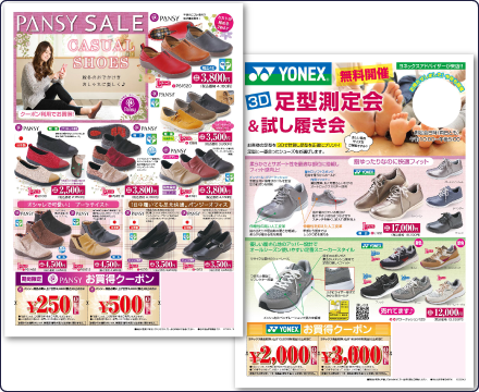 自信と実績のある価格訴求と商品量を確保した年3回のD3タイプチラシのほか、靴の仕入れ商材の負担が軽いB4タイプの季節のテーマにタイムリーなチラシも作成しております。